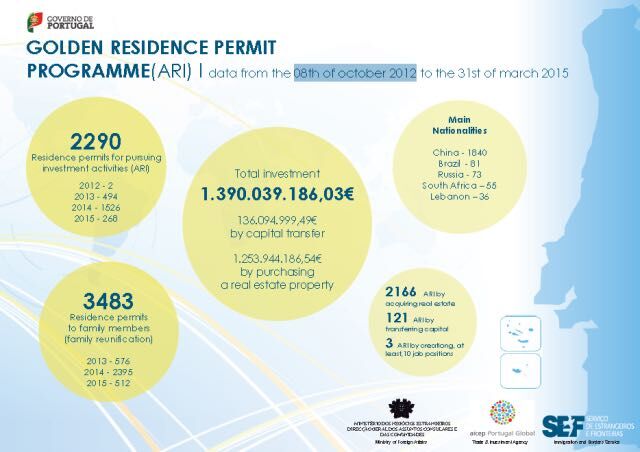 近日,葡萄牙移民局發(fā)布了截止到2015年3月31日最新的官方數(shù)據(jù),自2012年10月8日開始實施“黃金居留許可計劃”以來,累計成功獲得葡萄牙黃金簽證的人數(shù)已達到2290個,投資總金額已超過13.9億歐元。其中,通過購置房產(chǎn)獲得身份的人數(shù)為2166個(約占總?cè)藬?shù)的95%),投資金額約為12.5億歐元。主要購房人群來自中國,共計1840個。通過申請家庭團聚獲得居留卡的人數(shù)為3483個。