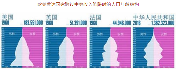 (注:年齡數(shù)據(jù)由上到下為遞減,頂端為高齡老人,底端為嬰幼兒,可看出目前中國人口結構與1990年時期的日本相似) ◆世界歷史上,凡是達到中國當前年齡結構的地區(qū),全都進入低速增長甚至停止增長。 ◆現(xiàn)有的發(fā)達經濟體,在其跨過中等收入陷阱的時期,都比當前的中國年輕許多