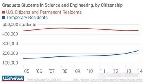 與此同時,美國公民學習STEM專業的人數卻在下降。根據美國國家科學基金會(NationalScience Foundation)統計,從STEM專業本科畢業的美國公民自2010年起一直在下降,而2014年獲得STEM專業研究生學歷的美國公民更是比2008年下降了5%。