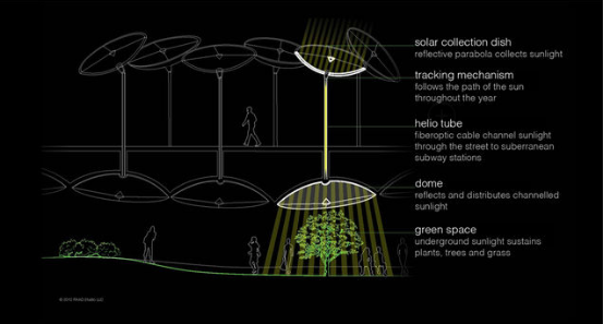 項(xiàng)目使用的,是詹姆斯發(fā)明的一項(xiàng)叫“遠(yuǎn)程天窗”的技術(shù)。他們要在德蘭西街的地面上,立起很多像向日葵一樣的電子設(shè)施,用凹面鏡迎著太陽(yáng)的方向走,把陽(yáng)光集中收起來。之后,這些陽(yáng)光通過光纖電纜輸送到地下,過濾掉有害的紫外線和過度的熱量,只保留光合作用需要的波長(zhǎng),滿足地下植物的生長(zhǎng)需要,同時(shí)保證空氣流通差的地下空間里,溫度不會(huì)過高。