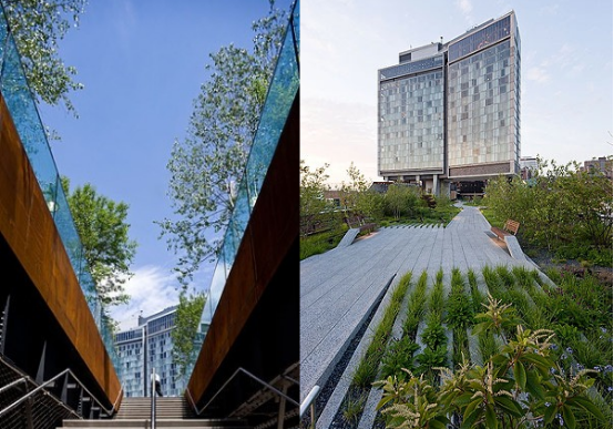 高線公園2009年向公眾開放,是由一條廢棄的高架鐵路改建成的空中花園走廊。從14街到34街,一路花花草草,可以走走停停,看看城市的天際線或者哈德遜河景。高線公園每年吸引了500萬游客,推動(dòng)沿線房產(chǎn)價(jià)格節(jié)節(jié)攀升,也開創(chuàng)了新的公私合營(yíng)模式。