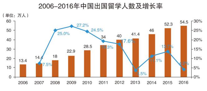 據中商產業研究院的數據顯示,中國出國留學的人數正逐年增加,相較于2006年的13.4萬的出國人數,2016年的出國人數增長了300%。