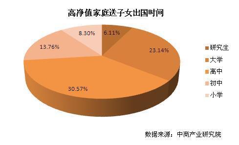 數據顯示,中國高凈值家庭送子女出國留學主要在高中階段,占30.57%,在子女還是小學時就送其出國的也占據8.3%,初中階段13.76%。大學階段占23.14%,研究生階段占6.11%。