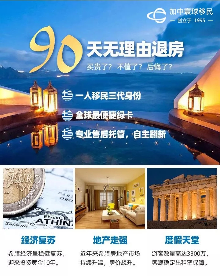 近期,加中寰球攜手希臘金牌開發(fā)商,重新定義希臘購(gòu)房移民末實(shí)現(xiàn),推出希臘購(gòu)房90天無(wú)理由退房促銷活動(dòng),徹底解除投資人的一切顧慮!