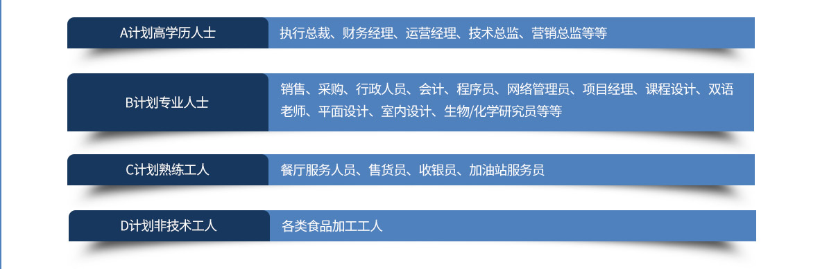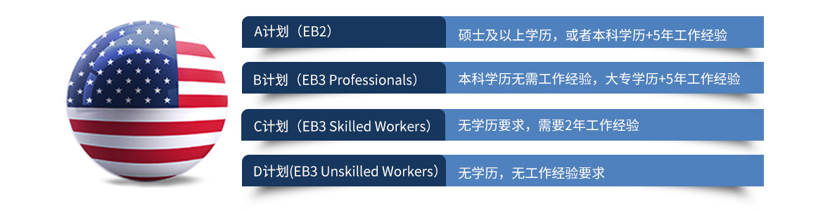 飛躍計劃介紹:包含A,B,C,D四個子計劃,對于申請人的學歷要求從高到低,幾乎覆蓋了全部行業全部人群。項目核心是申請人獲得美國合格雇主提供永久性工作的承諾(Permanent Job Offer)和申請勞工證, 由該美國雇主進行擔保,進而申請美國的合法永久居住權。