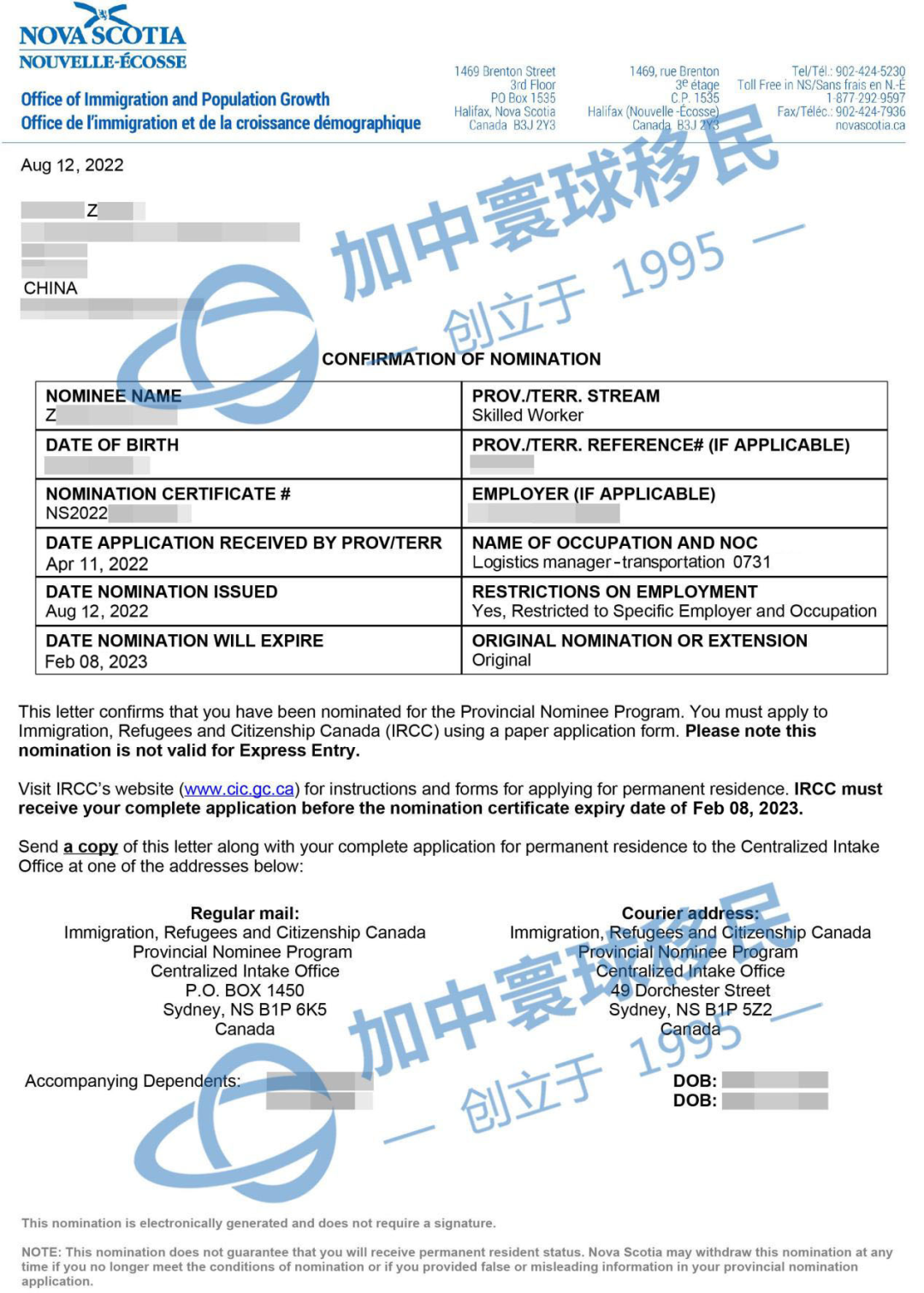 加中寰球移民客戶Z先生(物流經理)申請加拿大NS省雇主擔保移民,于2022年8月12日省提名獲批! 有關詳情如下: