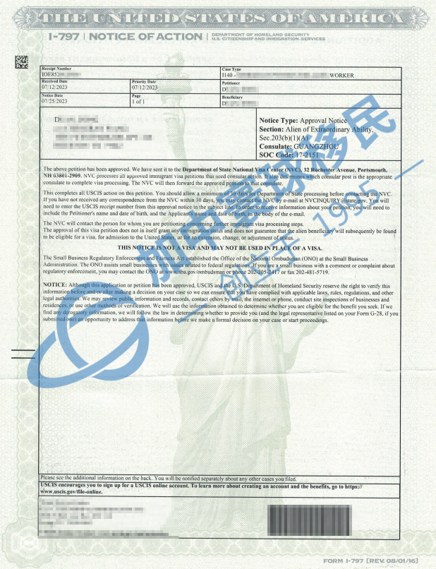 2023年7月26日,D先生I-140成功獲批,歷時共計9個月!