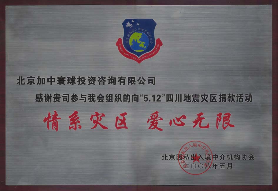 加中寰球情系災區,積極開展抗震救災行動,攜手Crystec捐助300萬元,并組建援助隊伍,奔赴災區工作。北京市出入境管理局及北京市出入境中介協會對我公司在四川汶川大地震中踴躍捐款一事提出表揚,同時頒發了榮譽證書。金色的牌匾不僅是榮譽的象征,更是樂善好施的見證,一方有難八方支援,加中寰球為災區人民送去濃濃的同胞親情。