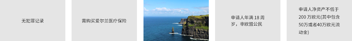 ![]() 投資要求: 投資100萬歐元至愛爾蘭央行批準的基金投資或者政府批準的企業投資; 捐款50萬歐元至藝術、體育、健康、文化或教育領域的愛爾蘭公益項目中。(團體捐贈捐為40萬歐元) |