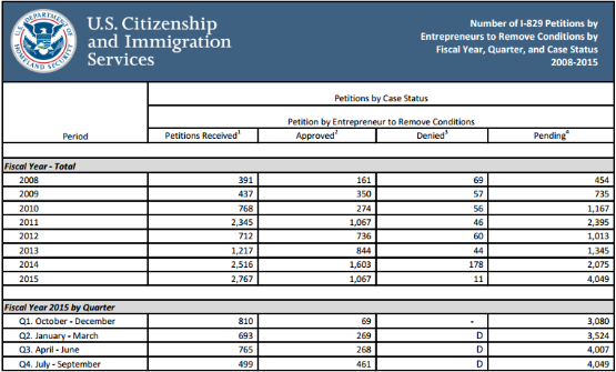 I-829在2015財年第四季度的收件數量為499份,全年一共收到2767份,比2014財年的2516份略有上升。2012年、2013年獲得臨時綠卡的一批投資人,已經開始進入了I-829階段,但由于I-829申請審核周期較長,導致I-829積壓數量明顯增加,2015財年末移民局尚有4049個I-829處于審核中,這比2014財年末的2075多了將近一倍。通過率方面,I-829依然維持在了相當高的水準,接近99%。