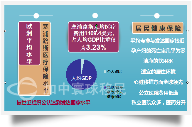 塞浦路斯在社會醫(yī)療保健方面的成就十分杰出,其醫(yī)療保險水平高于歐洲的平均水平,被世界衛(wèi)生組織公認為達到發(fā)達國家的水平,尤其是在心臟移植方面全球領先。政府報告顯示,塞浦路斯每480個人就擁有1名全科醫(yī)生,每1,100個人中就有1名牙醫(yī),每215人中就有1名護士。塞浦路斯人均醫(yī)療費用約1109.4美元,醫(yī)療費用占人均GDP比重僅為3.23%。