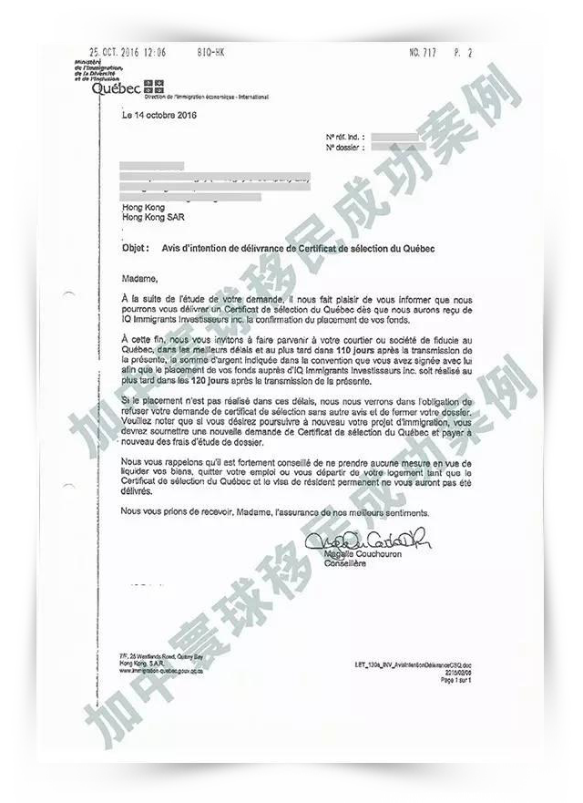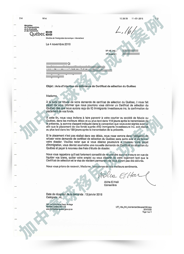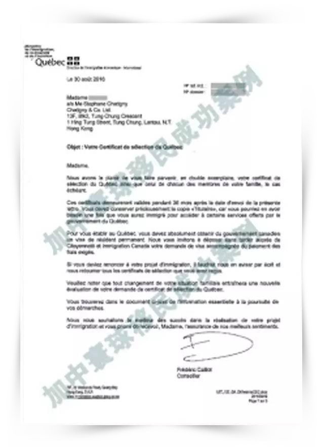 加中寰球根據Q女士背景迅速擬定了申請方案,并安排資深文案經理全程指導Q女士準備申請材料,一步到位鎖定名額。順利將材料遞交到魁北克移民局。當初的努力終獲回報,收到魁北克通過信。