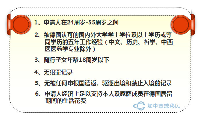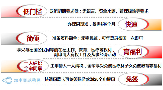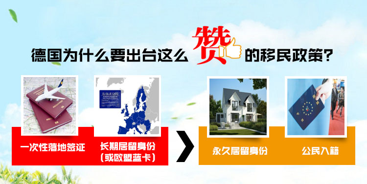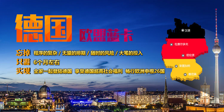 ![]() 德國修改并推出德國歐盟藍卡移民法案,旨在全球范圍內吸引高端人才至德國工作。于2012年8月1日生效的《外國人居留法》第19a條中明確約定:持藍卡居留德國,最快21個月獲得德國永久居留權;同時,在家屬團聚方面有極其優惠的措施。 客戶只需要有不太高的資金實力,在6個月左右的時間即可實現全家一起登陸德國,并且享受德國超高的社會福利。 德國大使館網站歐盟藍卡描述: ![]() 德國移民署官方網站 : ![]() 不需要像移民加拿大那樣復雜 不需要像移民美國那樣等待排期 不需要像移民澳洲那樣投入巨大 …… 像德國人一樣嚴謹、質樸、誠懇的藍卡項目 對您意義非凡,但并非高不可攀 2017,一輛駛向德國的幸福專列正期待您及家人的搭乘 |