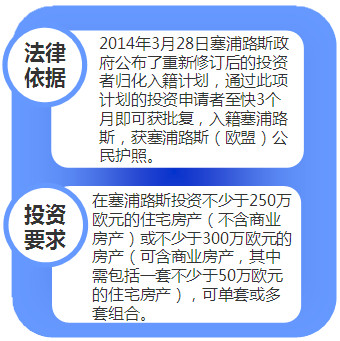 1. 評估與簽約2. 準備初期申請材料 3. 在塞浦路斯使館申請商考簽證 4. 到塞浦路斯看房、考察、簽署購房協(xié)議 5. 支付購房定金,開設(shè)銀行賬戶 6. 回國后在約定期限內(nèi)支付全款 7. 律師替申請人完成房產(chǎn)注冊手續(xù) 8. 準備申請材料,律師替申請人申請永久居留許可 9. 獲發(fā)久居留許可、外國人登記證 |
