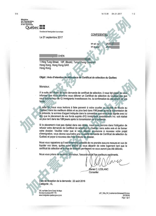 2017年11月24日又一批成功案例來襲:四客戶同一天收到魁省CSQ