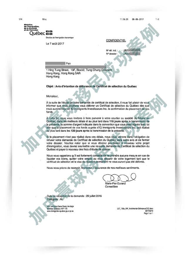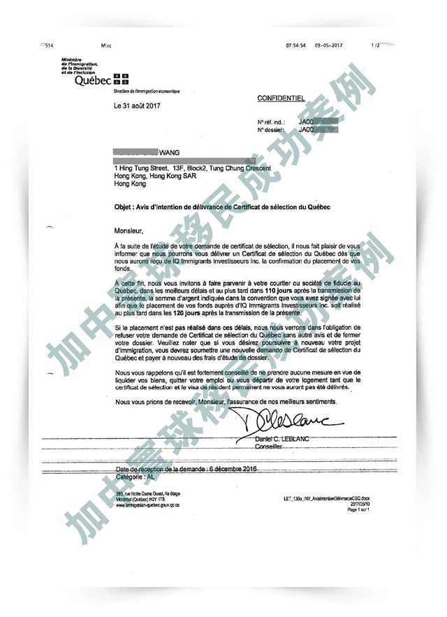 2017年11月24日,收到魁省提名證書(CSQ)。