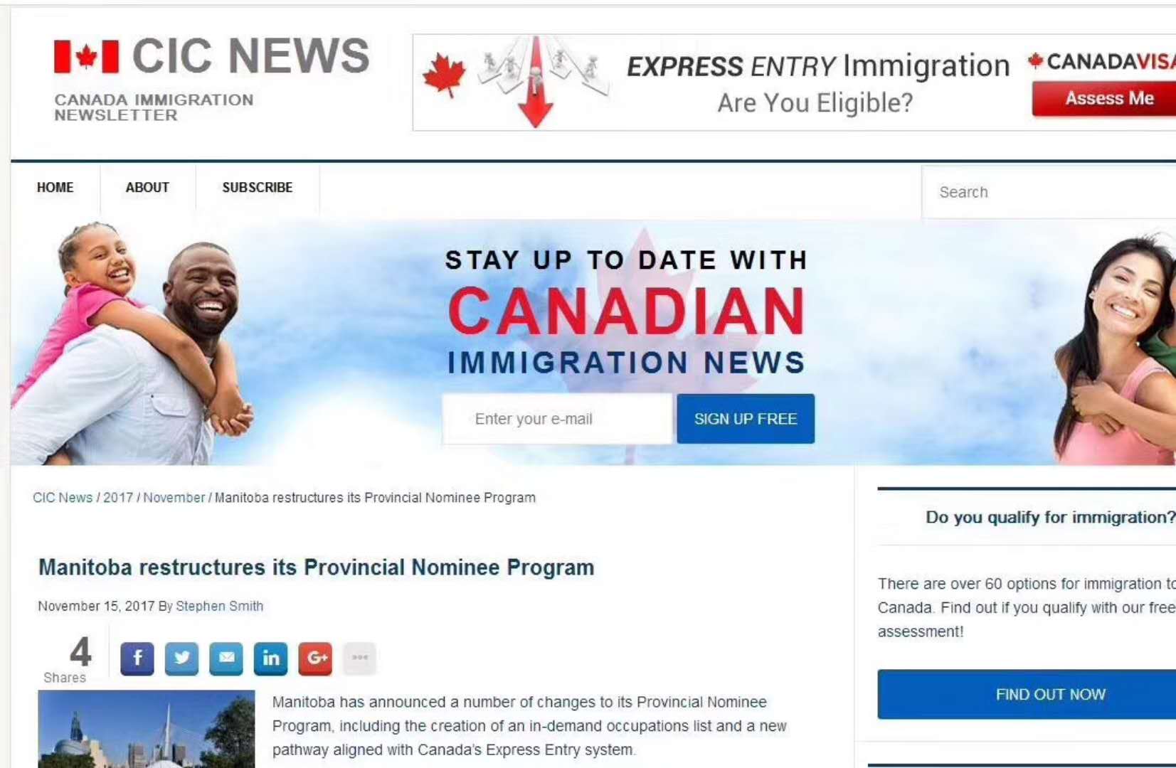 2017年11月15日,繼阿爾伯塔省宣布省提名政策將在2018年1月2日起實(shí)施新政后,曼省移民局也在其官網(wǎng)宣布了2018年移民新政策。