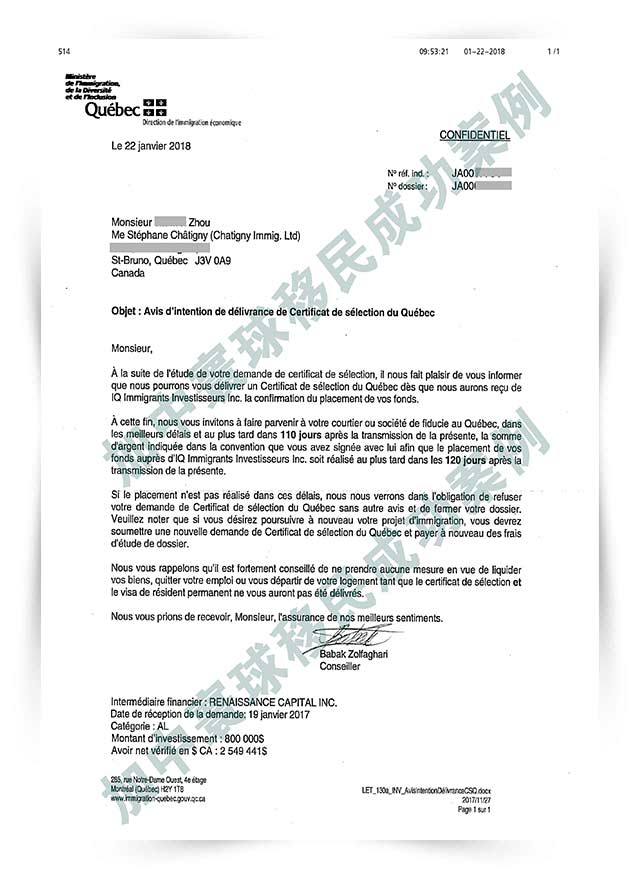 加中寰球憑借23年積累的加拿大移民代理經驗、專業的項目策劃和精深的文案制作以及完善的客戶服務,在跨入2018年之初,薩省、魁投等項目四處開花,今天一天有五位客戶的好消息: 于先生——全家收到簽證(薩省投資移民項目) 2015年4月20日,通過薩省EOI篩選; 2016年9月1日,收到薩省CSQ; 2017年1月23日,轉聯邦; 2017年3月17日,建檔; 2017年6月13日,收到體檢通知; 2018年1月23日,全家收到移民簽證。 于先生的移民過程在薩省提名階段一帆風順,但在轉聯邦過程出現了一點小小波折。在辦理移民申請的過程中,于先生在國內新開了一家企業,個人名下資產出現較大變動,而于先生并沒有及時與加中寰球的文案溝通這一重要信息,因此被聯邦移民局意向性拒簽,加中寰球及時幫助于先生補交了相應材料。加中寰球在此也鄭重提醒所有客戶:在移民過程中,凡涉及客戶申請人、家庭、婚姻方面的任何重大變化,都要及時告知加中寰球,讓加中寰球的移民專家根據實際情況準備相應的申請材料。 以下為掃描件(部分個人信息已做遮擋處理)