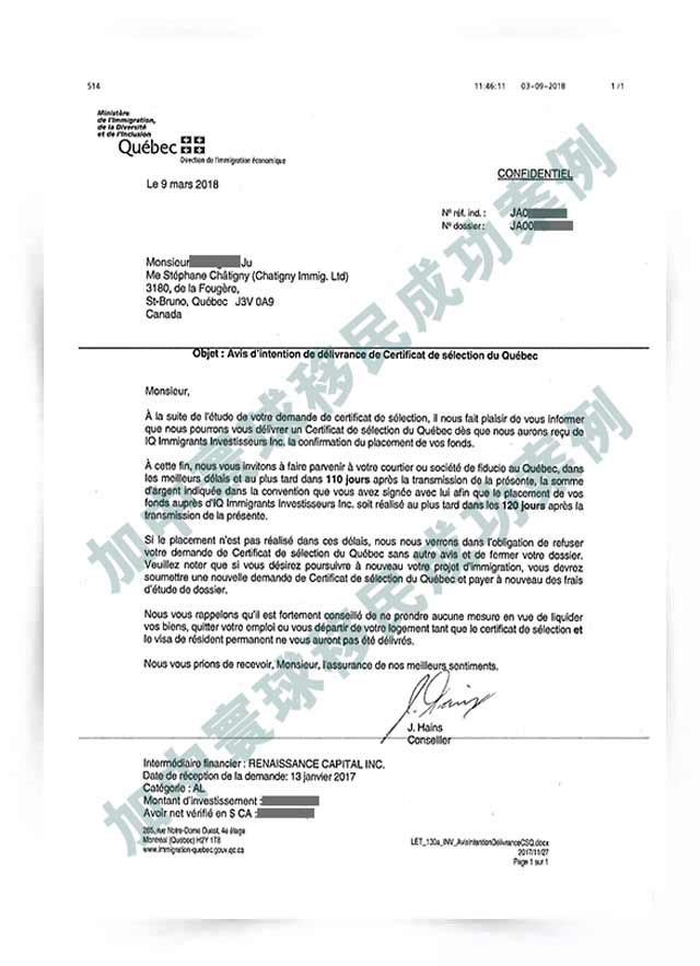 L先生 收到CSQ(魁北克投資移民項目)