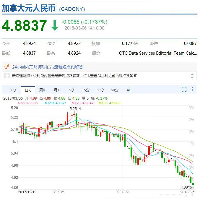 進入2018年以來,,從1月8日加元兌人民幣達到5.2514之后,加元便一路走低,到3月6日的4.8837,已經下跌3677點,跌幅達到7%! 與2017年7月26日的5.4358相比,加元跌幅達到10.2%!這兩個月以來,人民幣兌加元走出了一波沖天大牛行情!
