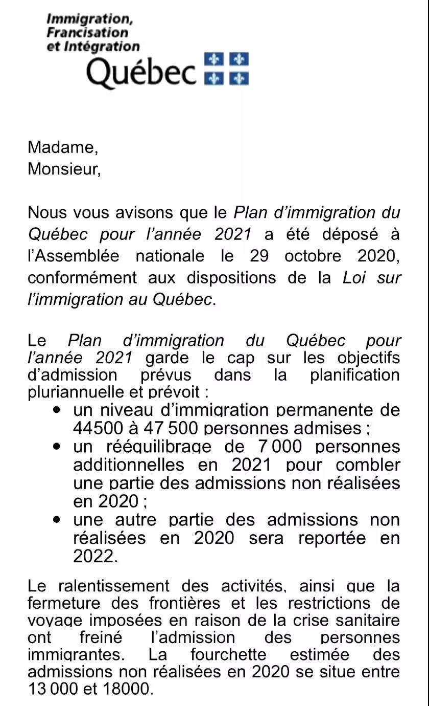 魁北克省移民部表示,作為彌補,其2021年的目標將多錄取7000人。