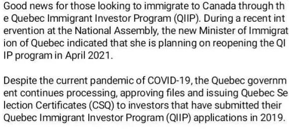 此前,魁省新上任的移民部長宣布,計劃在2021年4月重開魁北克投資移民項目。我們預計,魁投項目重啟后相關政策和移民配額的分配情況將維持不變。
