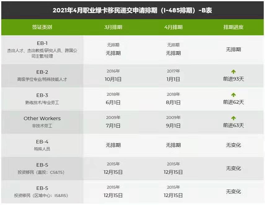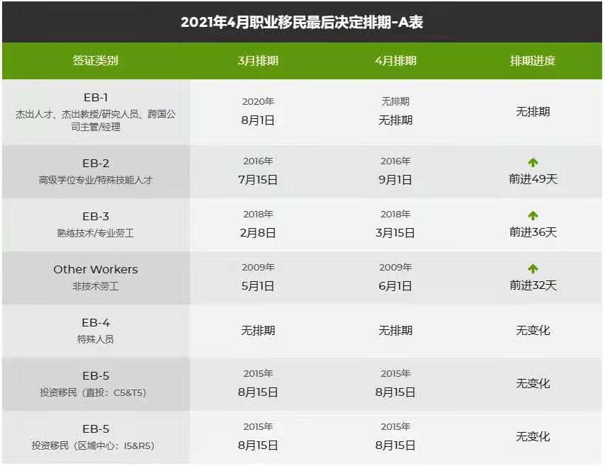 美國移民排期2021年4月綠卡排期公布:職業(yè)移民第一優(yōu)先類別EB-1(包括EB-1A杰出人才移民和EB-1C跨國公司高管移民)重回?zé)o排期時代!EB-1A杰出人才移民和EB-1C跨國公司高管移民迎來最佳移民申請時機!