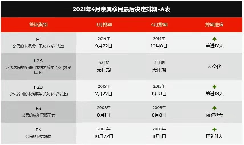 親屬移民前進緩慢,F(xiàn)1 公民未婚成年子女前進17天,F(xiàn)2B 永久居民未婚成年子女前進18天,F(xiàn)3 公民已婚成年子女前進8天,F(xiàn)4 公民兄弟姐妹前進11天。