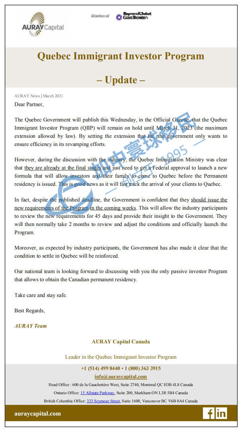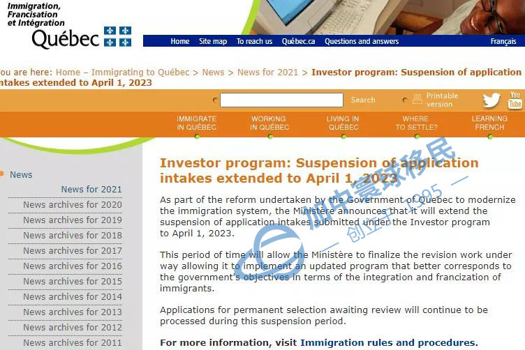 加拿大當地時間 2021年3月31日(周三),魁北克省在政府公報上正式公布:魁北克投資移民項目將暫停至2023年4月1日,目的是為了保證政府有充足的時間在此期間進行政策的調整。