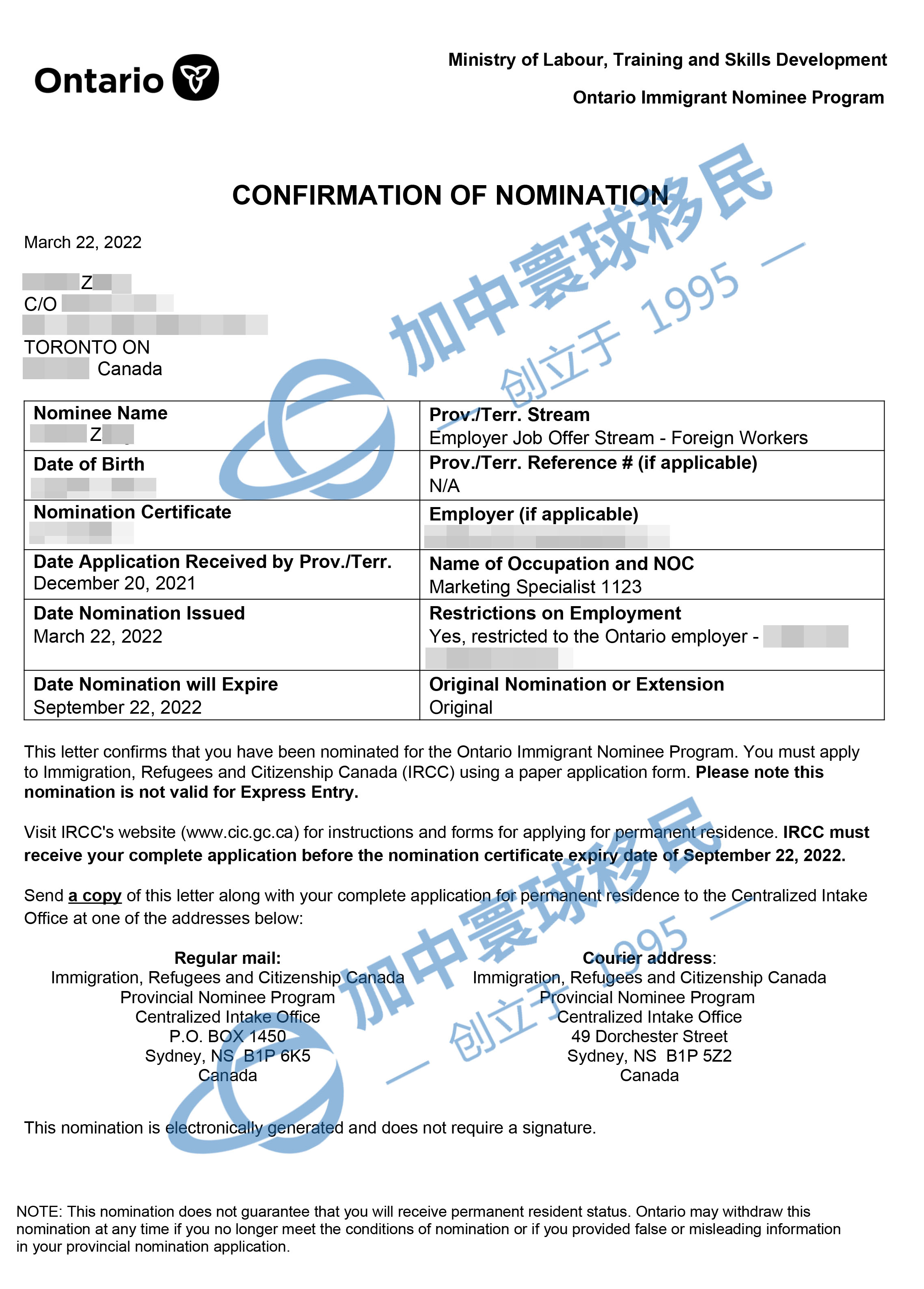 2022322,Z女士,34周,營銷專員,受邀3個月安省雇主擔保省提名成功獲批。有關詳情如下