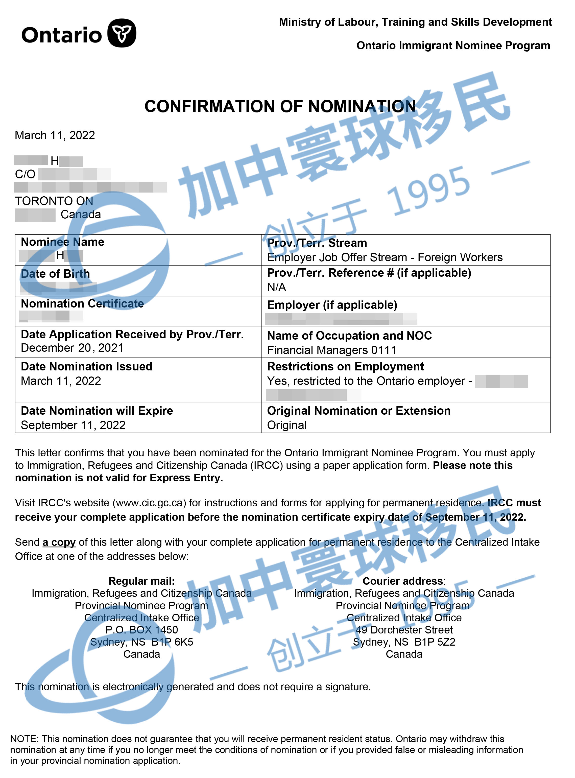 2022年3月25日,H先生,52歲,財務經理,入池3周獲邀請, 2.5個月安省雇主擔保獲批。有關詳情如下: