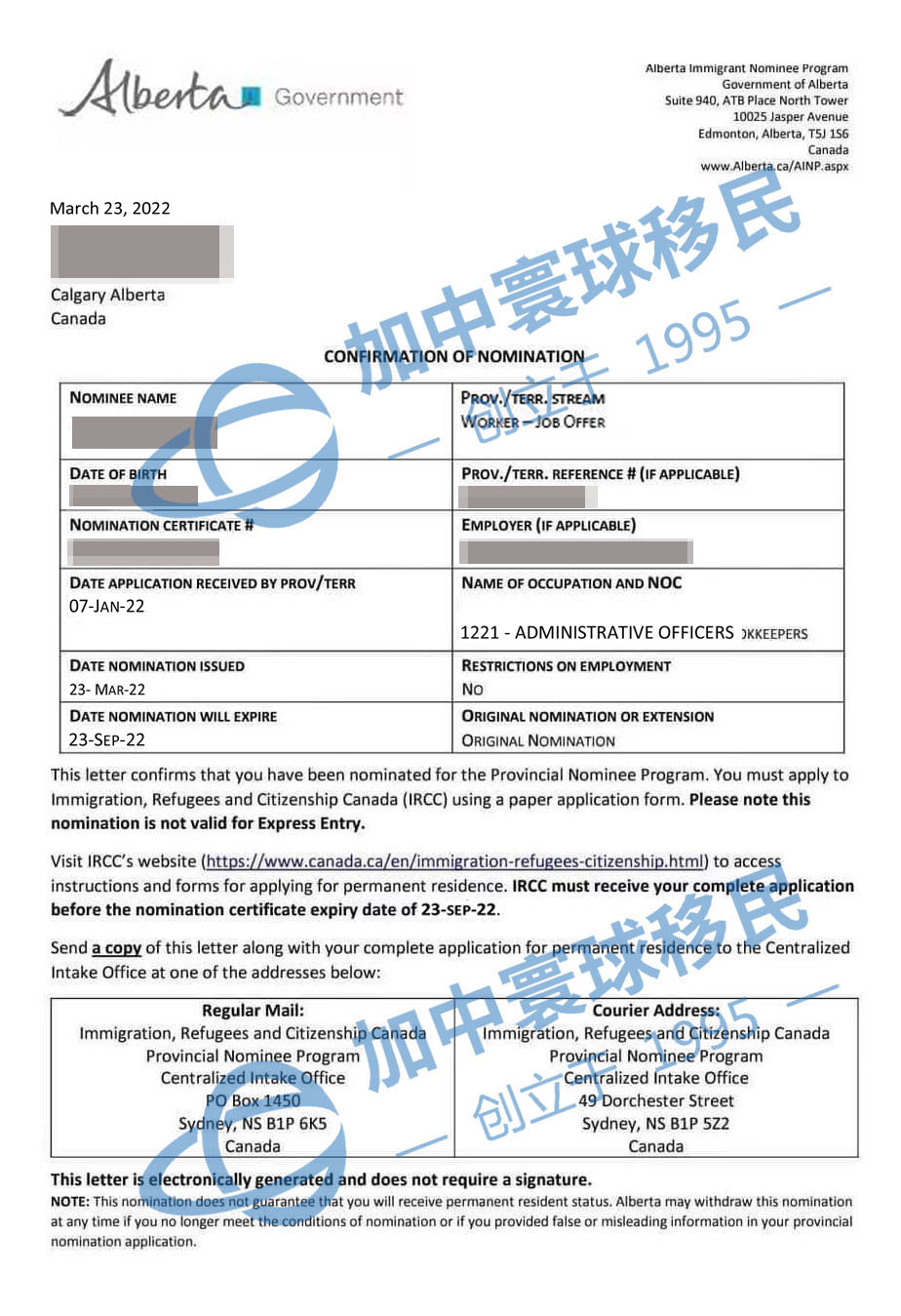 2022年3月23日,C女士,44周歲,行政人員,省提名2個半月阿省雇主擔保省提名成功獲批。有關詳情如下: