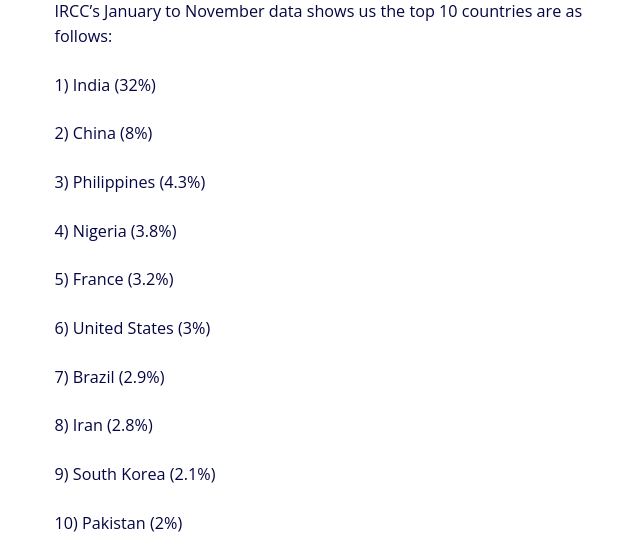 印度在2021年仍然是加拿大最大的新移民來源地,占了2021年移民人數的32%。中國是第二大來源地,占8%,約有32,424名來自中國的人士成為加拿大的永久居民。