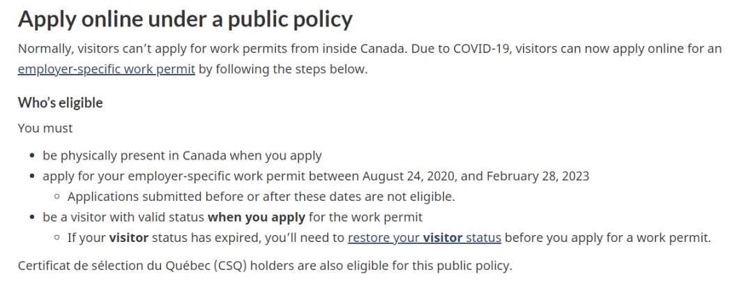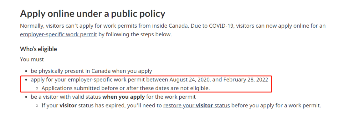 · 申請人在加拿大具有有效的訪客身份(如果訪客身份已過期,需要在申請工作許可之前恢復訪客身份);