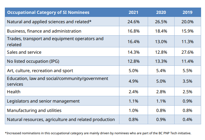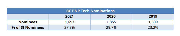 在2021年,BC省總計給科技類別候選人發(fā)出了1,697份省提名信,占到了全年發(fā)出省提名信總量的27.3%。