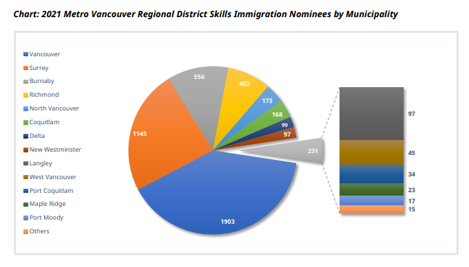 最多的大溫地區(qū)新移民選擇定居在溫哥華市,其次是素里市。