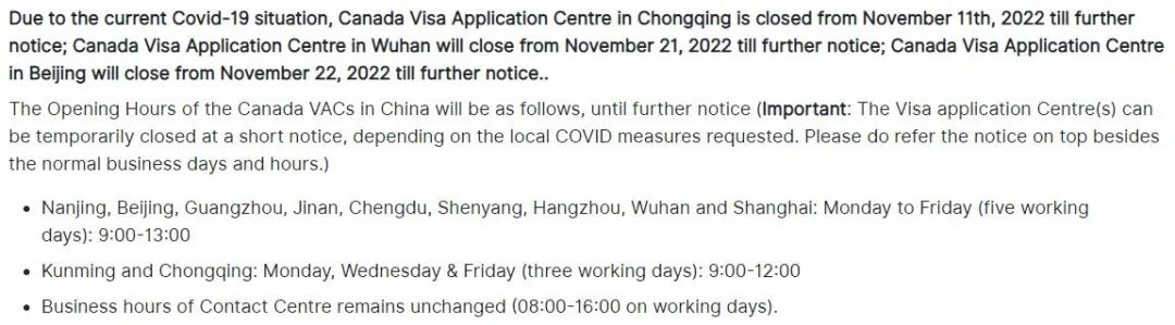 受疫情影響,加拿大簽證中心VFS Global近期在其官方網站上公布了一則重要通知,位于北京的加拿大簽證中心于2022年11月22日起關閉,而位于武漢的加拿大簽證中心已于2022年11月21日起關閉,位于重慶的加拿大簽證中心已于2022年11月11日起關閉,恢復時間另行通知。