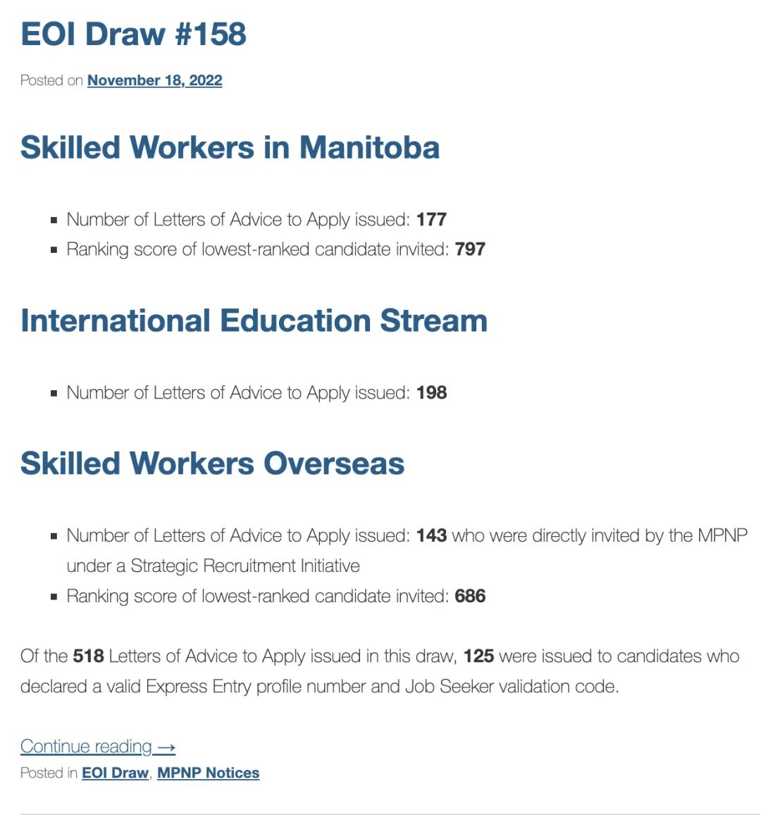 本輪共有518位申請人獲得邀請,其中有177位申請人來自曼省技術工人類別,需要達到797分的成績。其次有198位申請人來自國際學生類別,沒有分數要求。最后有143位申請人來自曼省海外工人類別,需要達到686分的成績。