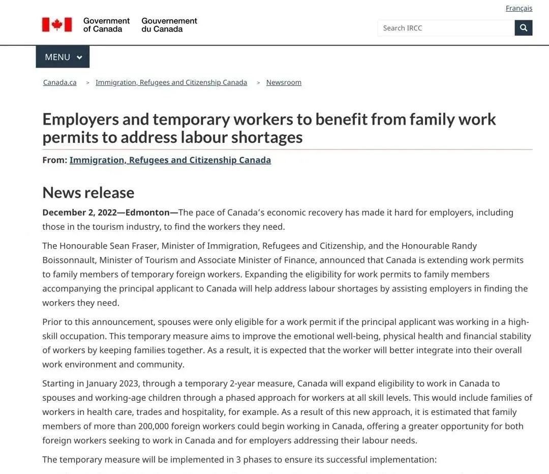 12月2日,加拿大移民局官網消息,從2023年1月開始,在接下來的兩年內分階段實施臨時政策,所有外國勞工配偶(即使是低工資封閉工簽持有者、農業工人)也可以給配偶申請開放式工簽了!