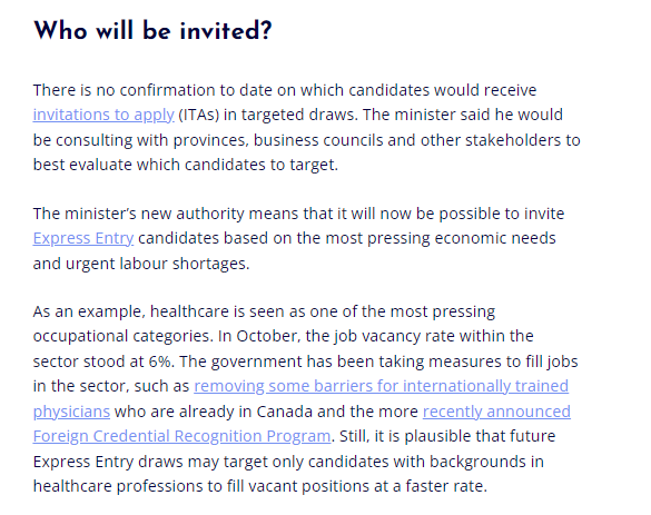 目前還沒(méi)有確認(rèn)哪些候選人會(huì)在有針對(duì)性的抽簽中收到申請(qǐng)邀請(qǐng) (ITA)。移民部長(zhǎng)弗雷澤表示,他將與各省、商業(yè)委員會(huì)和其他相關(guān)者進(jìn)行磋商,以最好地評(píng)估目標(biāo)候選人。