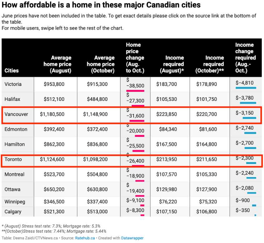 從Ratehub.ca收集的數據顯示,維多利亞州 (Victoria)10 月份的收入和平均房價降幅最大。維多利亞9月份的房屋均價為$915,300,壓力測試利率為7.44%,抵押貸款利率為5.44%。維多利亞10 月份購房者需要至少$178,890加元的年收入,才有資格獲得平均價位房屋的抵押貸款,首付款為20%。