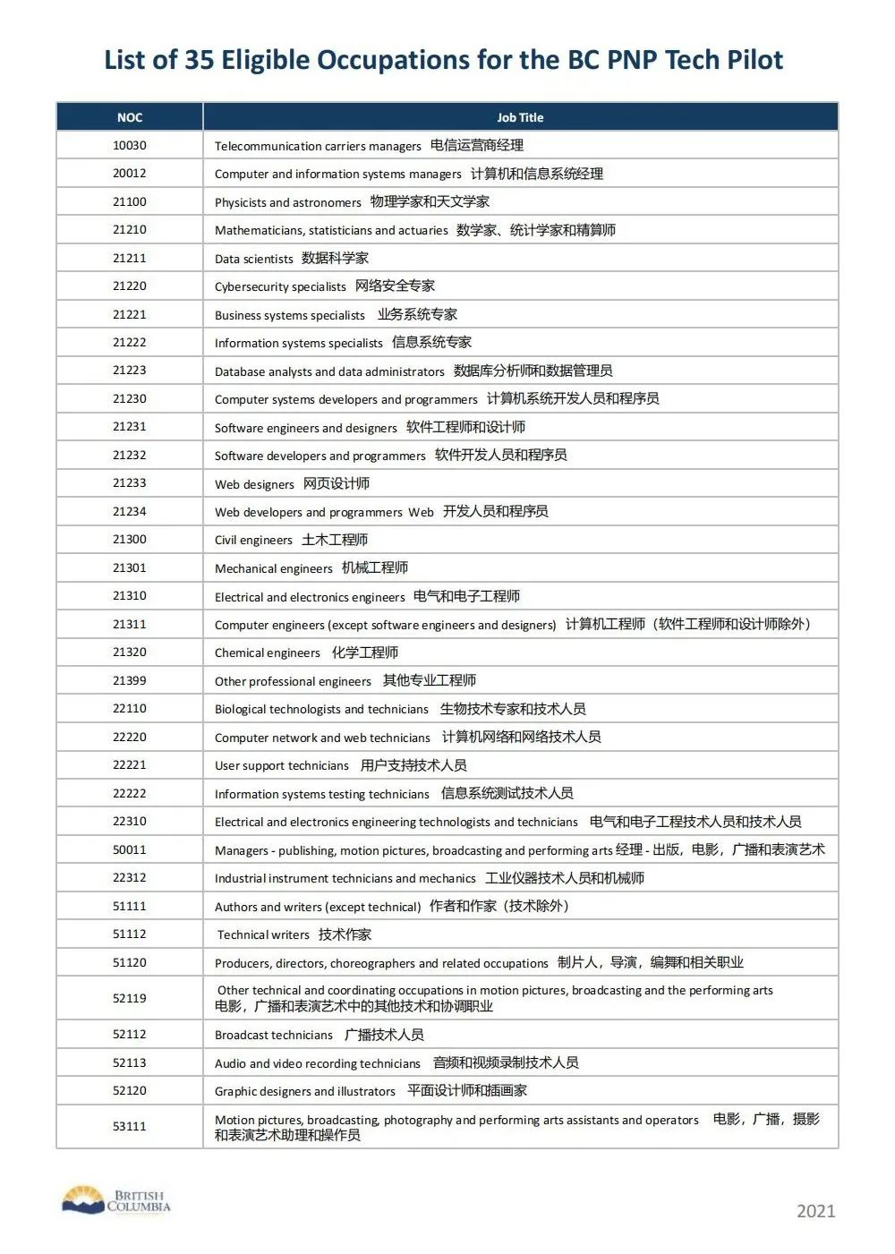 BCPNP Tech最新35個符合條件的職業(yè)