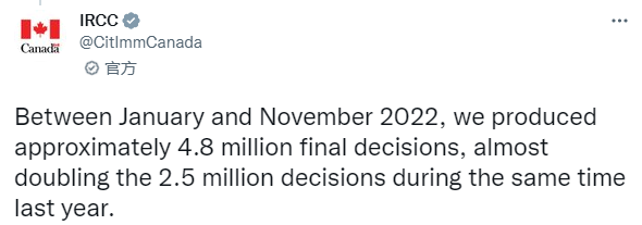 加拿大移民部部長(zhǎng)也強(qiáng)調(diào)了今年移民局在申請(qǐng)?zhí)幚矸矫嫒〉昧似萍o(jì)錄的進(jìn)展。自8月以來(lái),移民部已減少了近50萬(wàn)份申請(qǐng)。截至11月底,移民部處理了大約480萬(wàn)份申請(qǐng),幾乎是去年同期處理申請(qǐng)數(shù)量的兩倍。