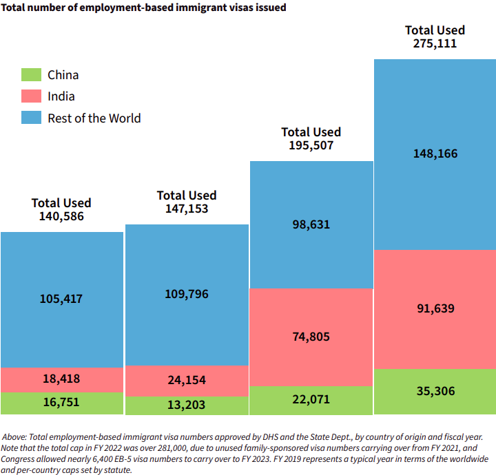 其中移民局和移民審查執(zhí)行辦公室EOIR共批準(zhǔn)了220,000多份針對人已經(jīng)在美國的、提交了I-485身份轉(zhuǎn)換的職業(yè)移民綠卡申請。2022年簽發(fā)的職業(yè)移民綠卡數(shù)量是疫情前的2倍。