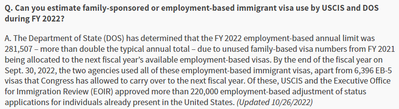 此外,根據(jù)2022年10月16日移民局官方數(shù)據(jù),截止2022年9月30日2022財年結(jié)束,除了國會允許的可以被轉(zhuǎn)移到下個財年繼續(xù)使用的6,396張EB-5投資移民綠卡,美國移民局和美國國務(wù)院使用了所有2022財年被分配的職業(yè)移民綠卡配額。