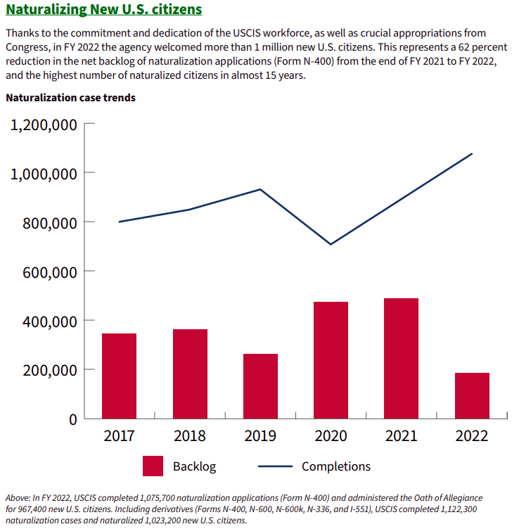 2022財年超過100萬移民成為美國公民,這意味著從2021財年末到2022財年,入籍申請(N-400表格)的凈積壓減少了62%。2022財年也是近15年來歸化公民人數(shù)最多的一年。