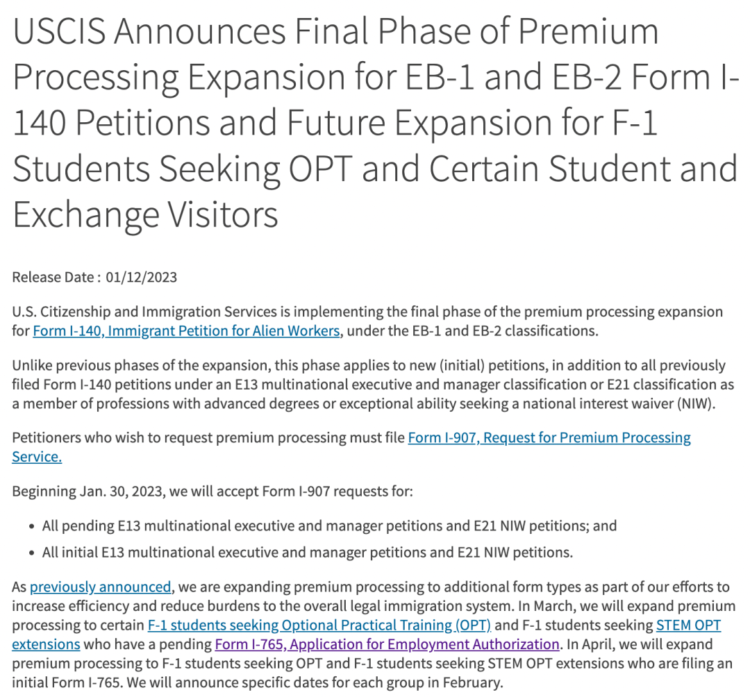 ·從2023年1月30日起,所有新提交的EB-1C和NIW的I-140申請(qǐng)也可以同時(shí)遞交PP加急申請(qǐng)了。