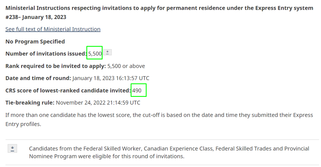 1月18日,加拿大聯(lián)邦EE快速通道不區(qū)分抽選類別,向快速通道候選人發(fā)出了5500份邀請,抽選分490分。