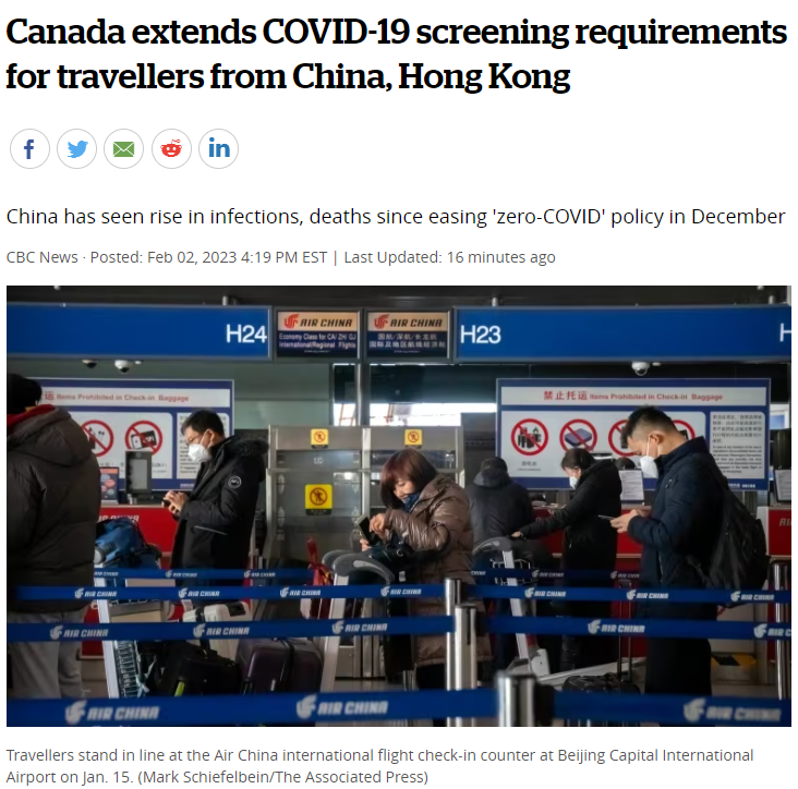 加拿大衛生部發布聲明,將于2023年2月4日起延長從中國大陸、香港和澳門乘飛機抵達旅客的入境檢測要求。
