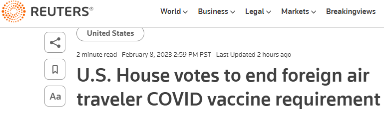 美國(guó)眾議院于2月8日投票決定終止要求大多數(shù)外國(guó)旅客接種 COVID-19 疫苗的要求,這是剩下的幾項(xiàng)為數(shù)不多的大流行病旅行限制之一。